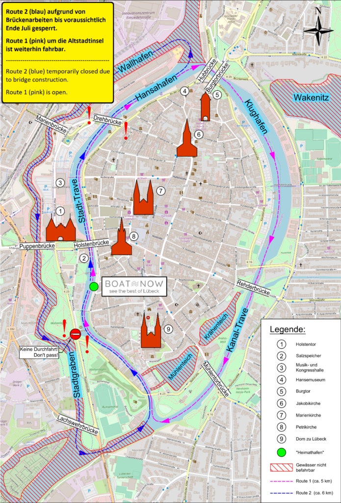 Entdeckt Lübeck's Wasserwege und Sehenswürdigkeiten. Für beide Routen benötigt ihr jeweils eine Stunde.